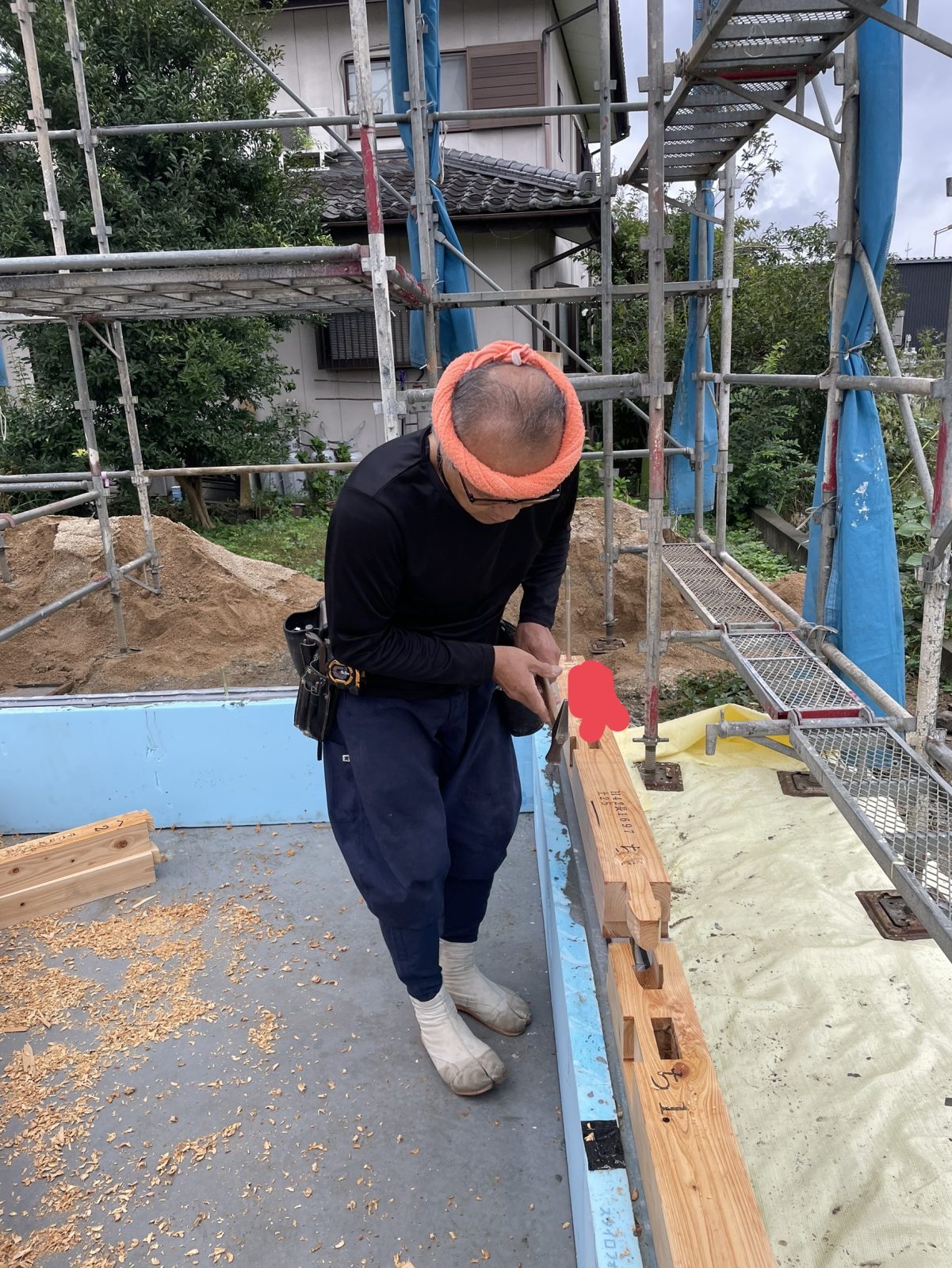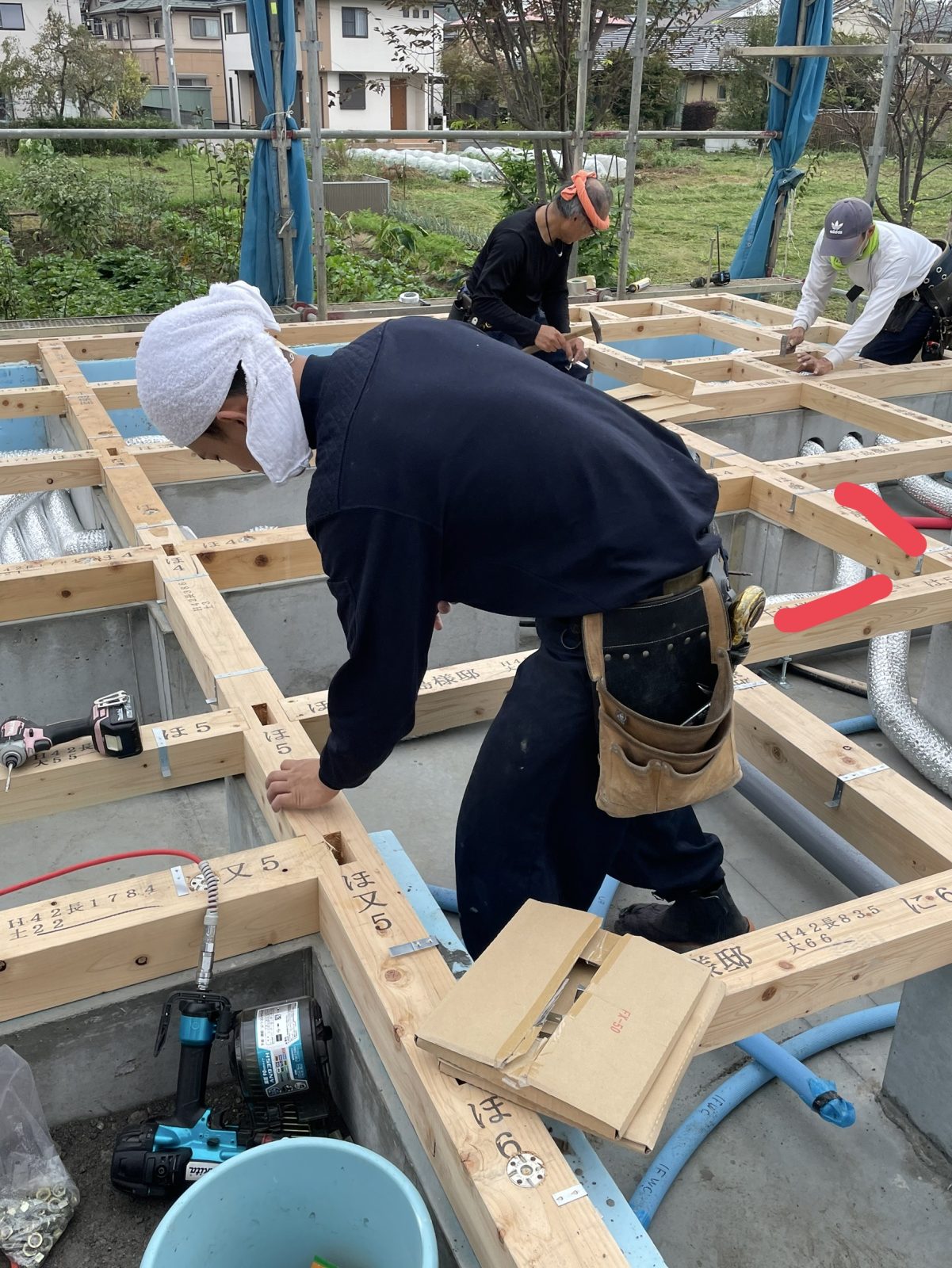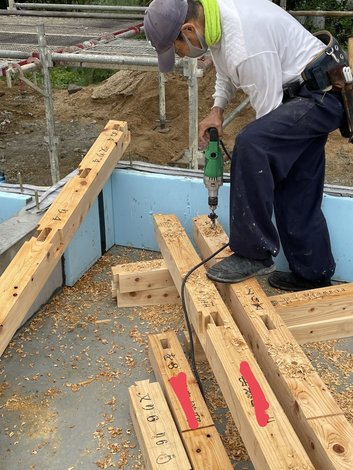 明日の上棟に向けて先日土台敷きを行なってきました。