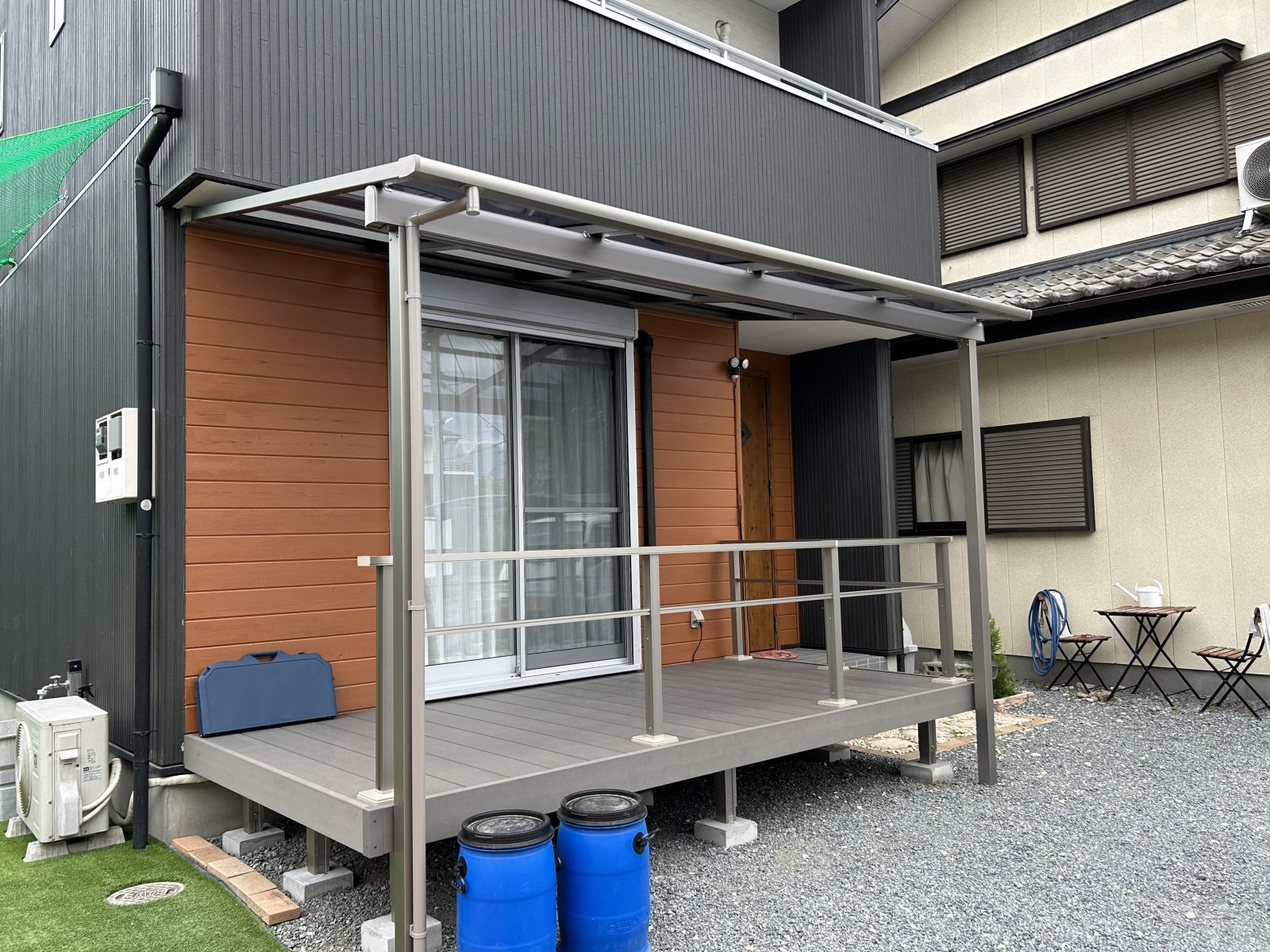 合わせてウッドデッキとテラス屋根の取り付け工事も行わさせていただきました。